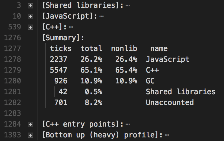 $ node --prof-process isolate-0XXXXXXXXXXX-v8-XXXX.log > profile.txt